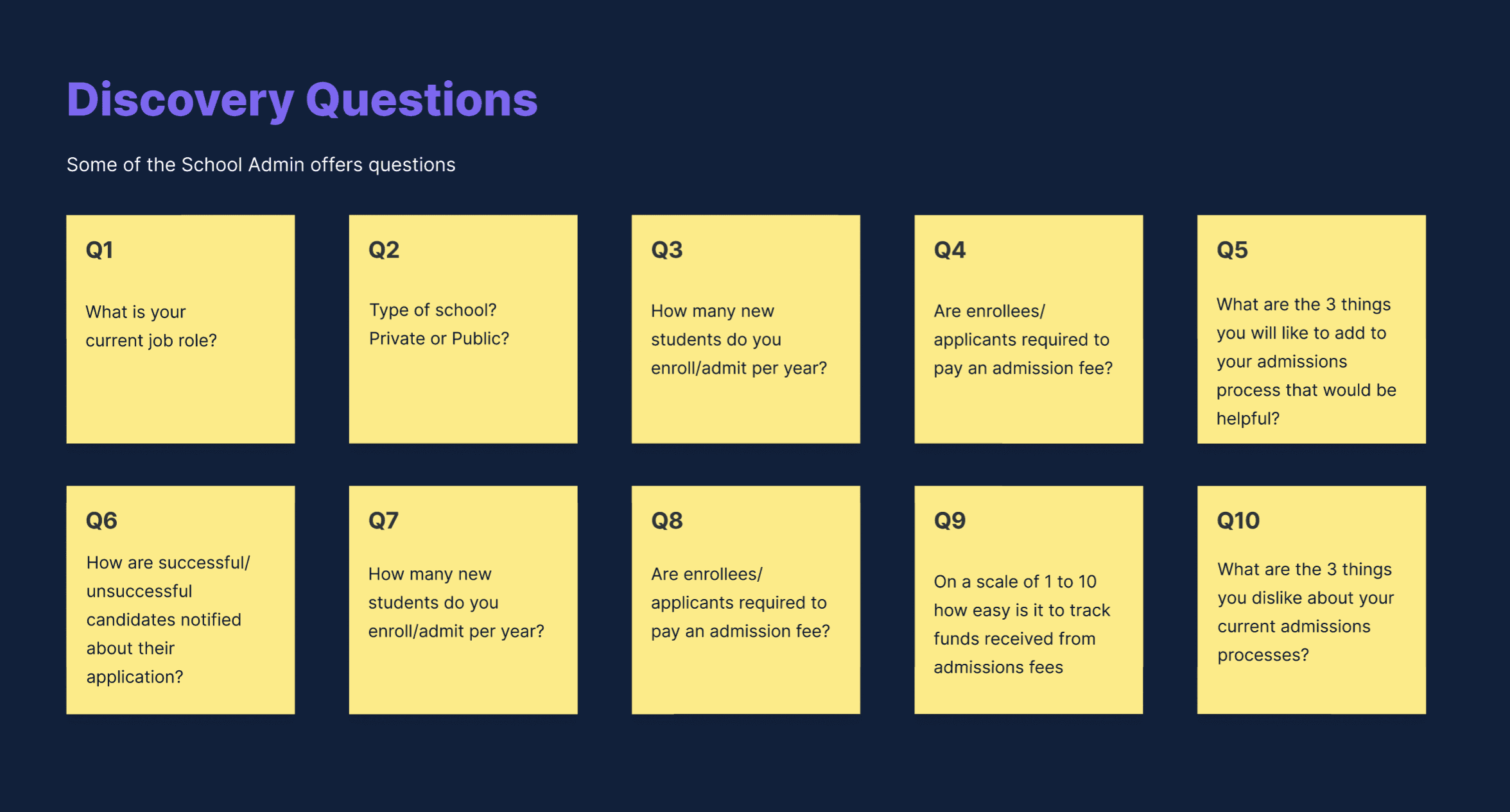 During the discovery process, the primary goal was to gather a deep understanding of how different institutions handle their admission process and identify the major pain points that applicants face.