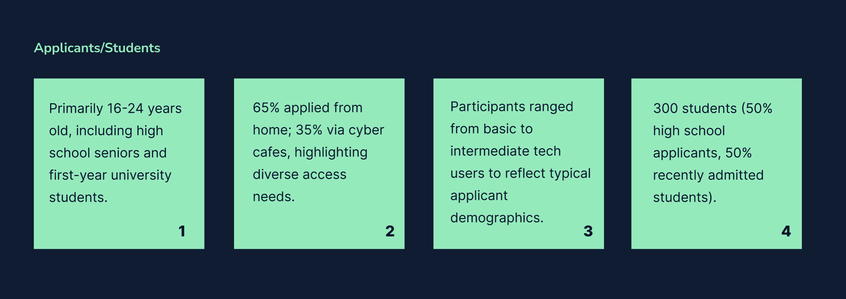 I conducted an online survey with 300 high school and tertiary institution applicants and existing students, the survey also included 50 parents to gather quantitative data in their experiences and preferences.